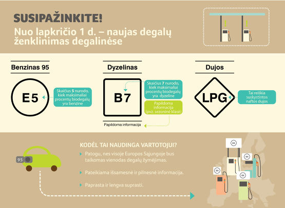 從2018年起 11月1日 出售的汽油加油站將被標記以詞“汽油”,表示辛烷值(95; 98)和所述字母E和一個數5或10,指示由體積的汽油的生物燃料最大(乙醇)含量百分比。柴油 - “柴油的字,并與圖7,圖10,20或30,其指示最大生物燃料(脂肪酸甲基酯),柴油燃料的每單位體積的百分比結合字母B。