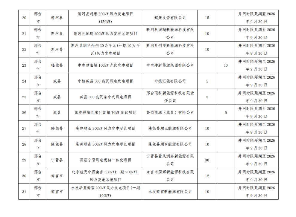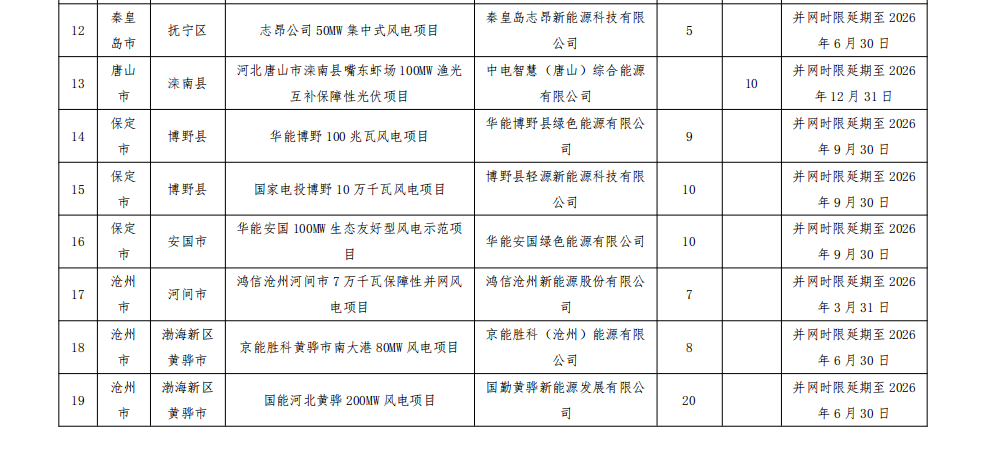 按照《河北省風(fēng)電、光伏發(fā)電項目開發(fā)建設(shè)管理辦法(試行)》要求,請各市進(jìn)一步加強(qiáng)風(fēng)電、光伏發(fā)電項目管理,推動后續(xù)項目嚴(yán)格按照并網(wǎng)時限要求建成并網(wǎng),除不可抗力等客觀因素造成項目不能按期全容量投產(chǎn)的,未并網(wǎng)的項目一律取消、未并網(wǎng)的規(guī)模全部調(diào)減。