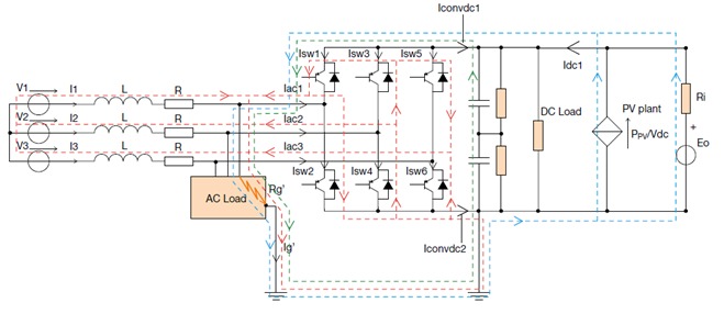 在交直流混合電網(wǎng)中直流負載側(cè),顯然普通AC型剩余電流保護器無法完成保護,需要使用DC-RCD進行直流漏電保護,然而目前直流漏電保護還并未推廣和市場化,國內(nèi)也尚無相關標準。實際上,在交直流混合微電網(wǎng)中,漏電成分是非常復雜的,我們來看下ABB對于交直流混合微電網(wǎng)中交流側(cè)接地故障的仿真模型。