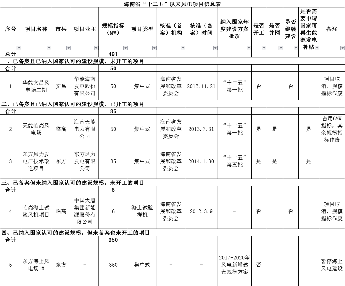 ,海南省取消未開工項目華能文昌風電場二期工程,合計50MW;臨高海上試驗風機項目,合計6MW;天能臨高風電場項目中的44MW建設規模指標。暫停東方海上風電場1#項目350MW工程建設。