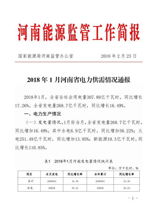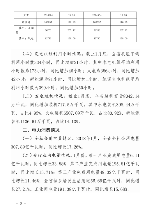 2018年1月,全省全社會用電量307.89億千瓦時,同比增長17。26%。全省發(fā)電量268.7億千瓦時,同比增長16.49%。以下為具體數(shù)據(jù):