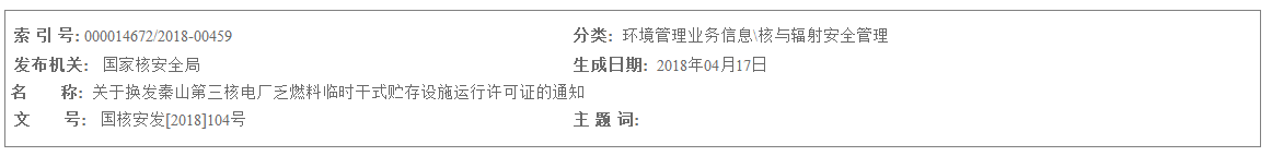 關于換發秦山第三核電廠乏燃料臨時干式貯存設施運行許可證的通知