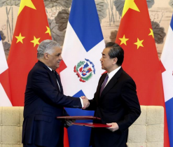 5月1日,國務委員兼外交部長王毅在北京同多米尼加共和國外長巴爾加斯簽署《中華人民共和國和多米尼加共和國關于建立外交關系的聯合公報》。新華社記者丁林攝新華社北京5月1日...